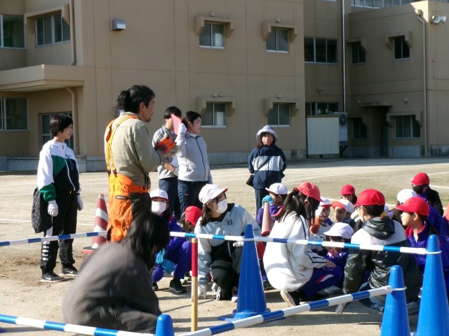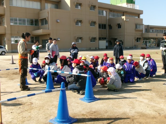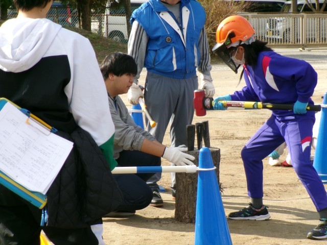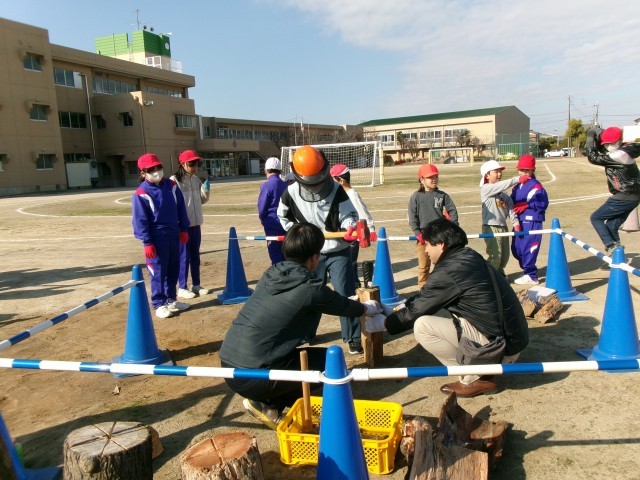 ハンマーで叩いていきます。児童一人ひとりが順番で、ヘルメットをかぶり、ハンマーで10回ずつ叩いていきます。