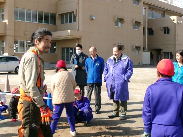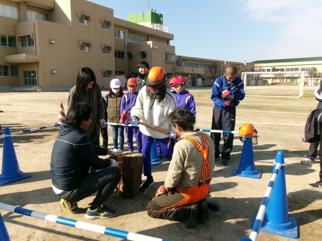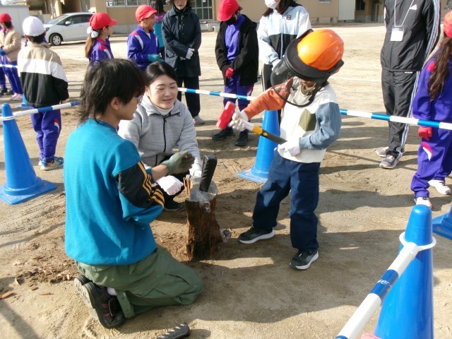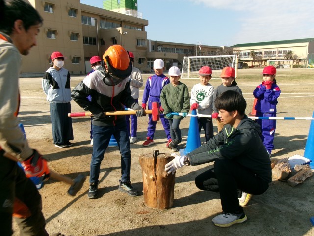 校庭では、昨日から準備していただいた薪を「くさび」という道具を使って、隙間に打ち込んで薪の材料となる木を