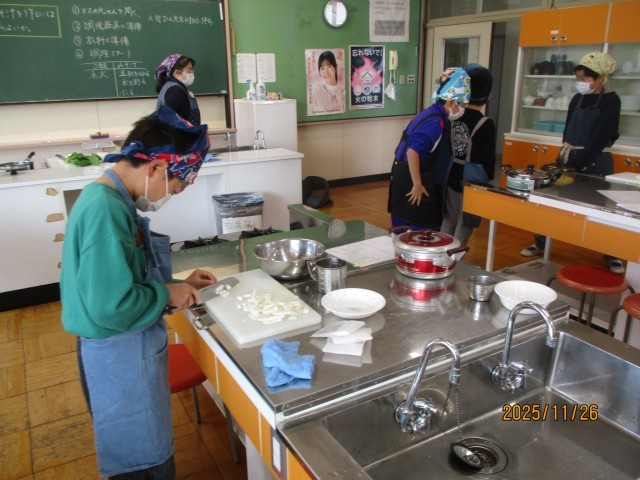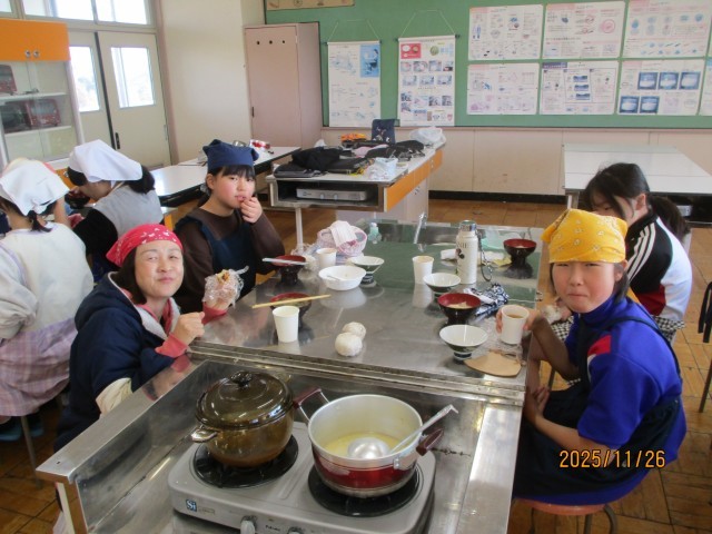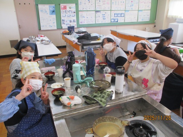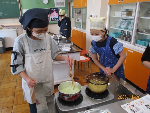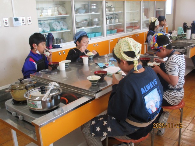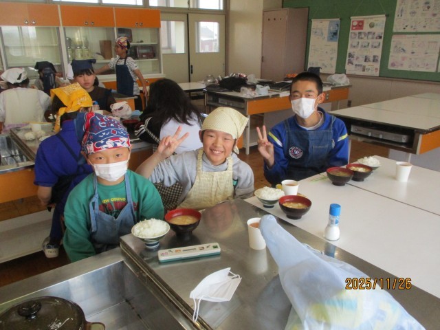 水曜日の2・3時間目に調理実習を行いました。ご飯と味噌汁を作りました。ご飯は、今年採れた新米を鍋で炊きました。また、お味噌汁は、各班で考えた具材とお味噌を使って、調理を行いました。子どもたちは、自分で作ったご飯と味噌汁に感動していました。その日の夜、早速自分でお味噌汁を作って、家族の夕食に振るまったと話す児童もいました。次回の調理実習は、「より手の込んだものに挑戦したい」と話していました。