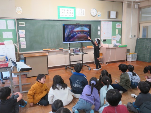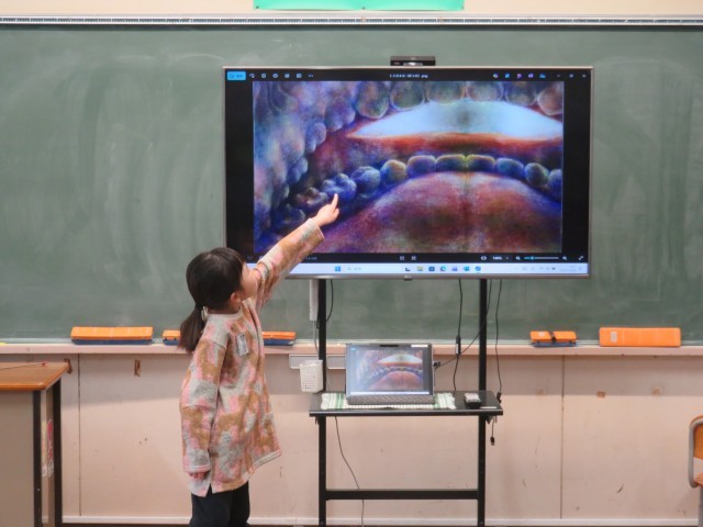 今日の絵をみて、まず「口の中を内側からみた絵」という発言がありました。次に、「白いところは歯医者さんが治療するために近づいてくる影」「白いところが目に見える」「ここが木の根っこみたい」「色が虹色」などなど、発表は尽きません。