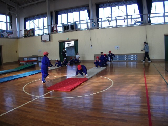 ゆりかご、アンテナ、前転、後転などをやって、壁倒立に挑戦しました。