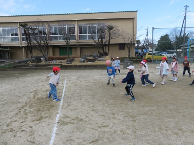 「中あてってどうやるの?」「え~!幼稚園でやったのとちがう~!」とおおさわぎ!体育で、ボール遊びをしたばかりだったので、みんな楽しそうに中あてをしました。へびおには、赤白2チームに分かれて勝負しました。「クラスレクだから、楽しくやろうね。」と勝負にはこだわらず、みんな笑顔です。