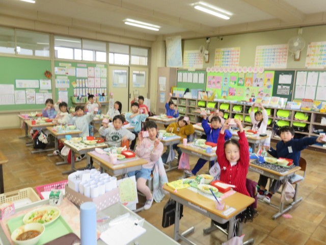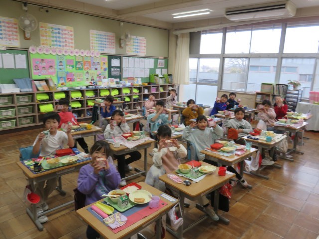 給食は、クリスマスメニュー!みんな、チキンやチョコケーキを楽しみにしていました。