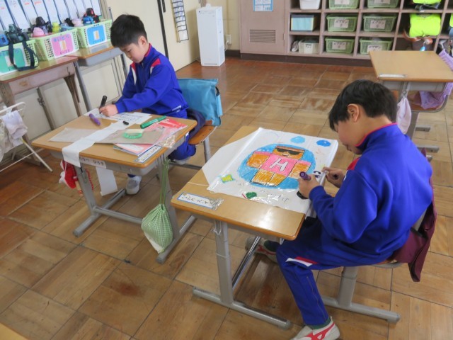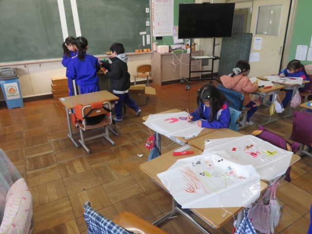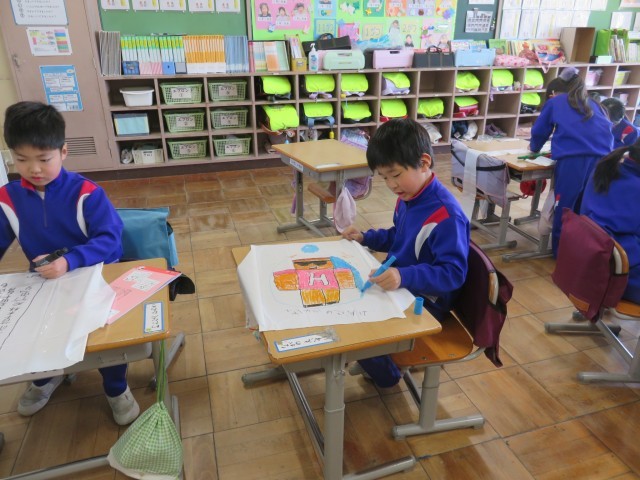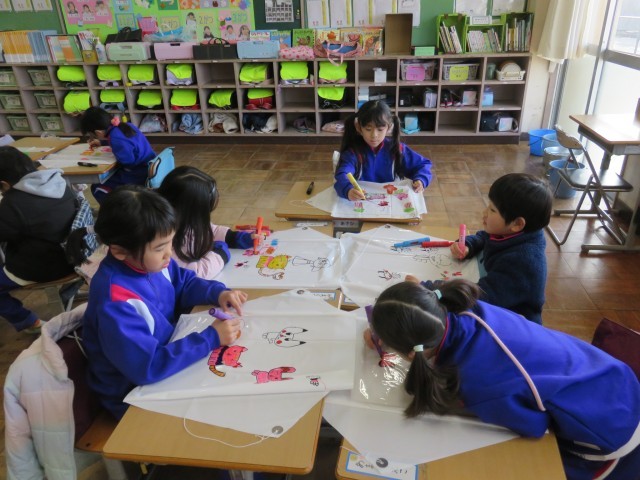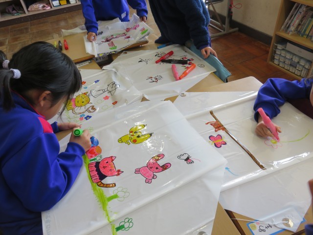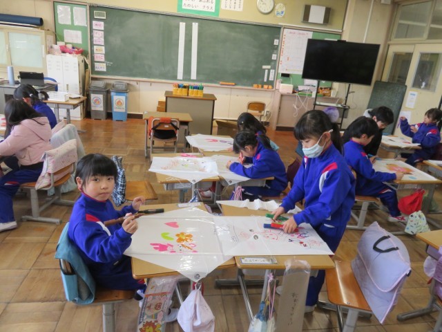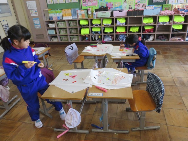 生活科で、冬の遊びを話し合いました。冬の遊びは何だろう!の問いかけに、「昔の遊び」「スキー」「スケート」などが出てきました。「冬は風が強いね。」と問いかけると、「凧!」と出てきました。「凧あげをしたことがある人!」と聞くと、「はーい!」「幼稚園でやった!」などの声が上がりましたが、凧あげをしたことがない人もいました。そこで、凧あげをすることになりました。でも、凧がありません。今日は、その凧作りです。凧の本体に自分がすきな絵や字を思いっきりかいて楽しみました。どんな凧が出来上がるか楽しみです!
