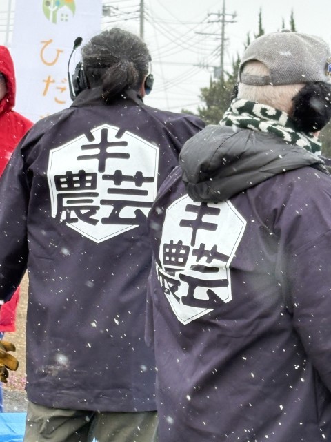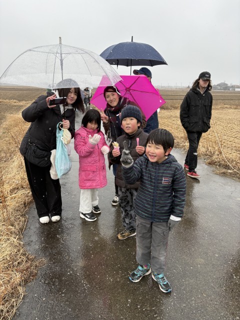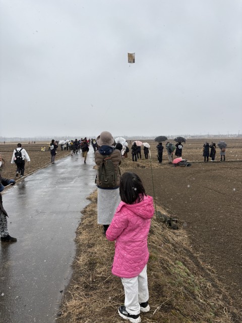 お昼に凧揚げの予定が、10時過ぎから雪模様。でも、予定通り決行です!!
