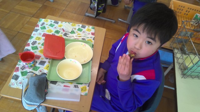 いざ、給食に出ると、おいしそうに食べていました。素晴らしい笑顔ですね。