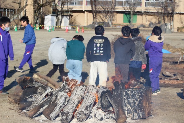 「あったかいねえ」と、火にお尻を向けるキッズ。