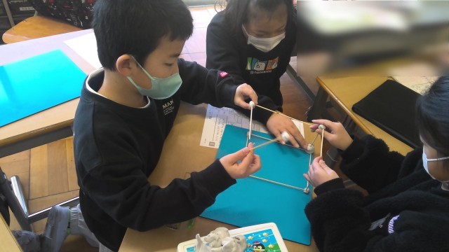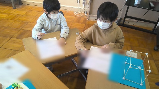2年生は「はこの形」の学習です。今日は、箱の辺と頂点の数について調べました。竹ひごを辺、粘土球を頂点として、箱の形を組み立てました。出来上がった形を見て、面の形や、使った竹ひごの長さにも注目して学びを深めました。
