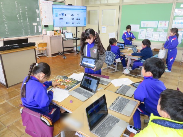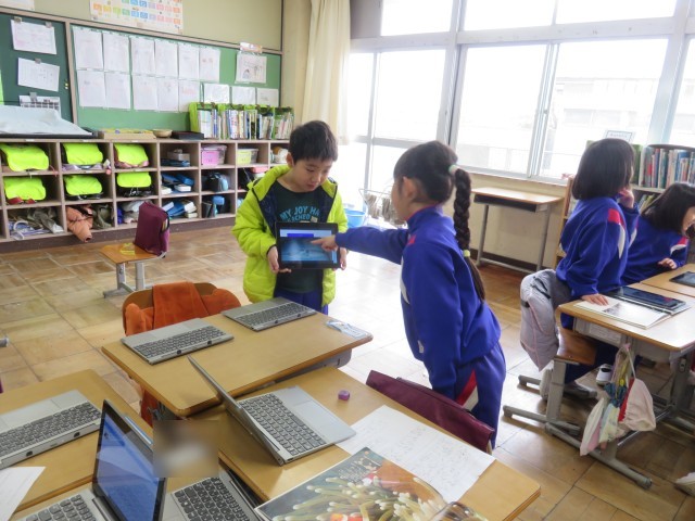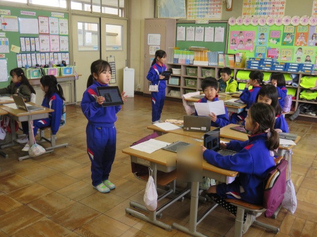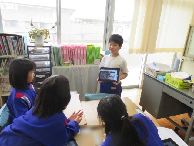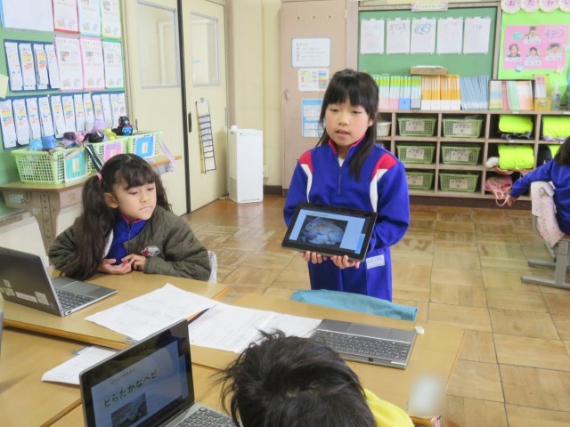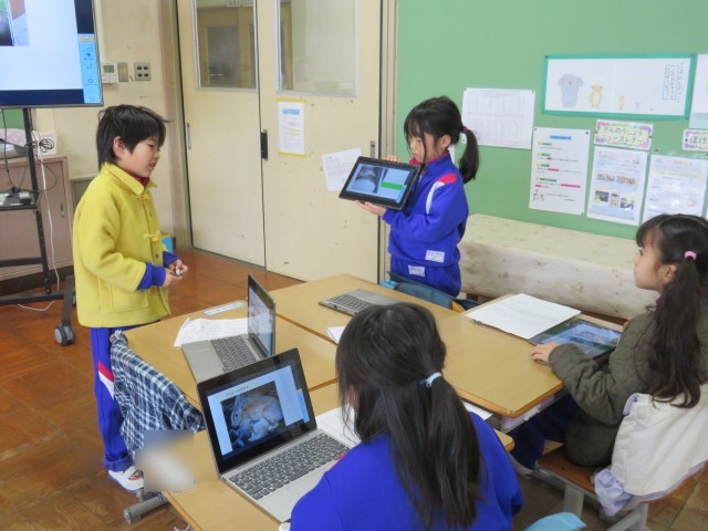 タブレットに調べた動物の写真のスライドを作り、グループで伝え合います。これまでに、何度も発表する活動をしてきたので、子供たちも慣れたものです。メモを見なくても、動物について紹介する姿が見られました。2回目はグループのメンバーをチェンジしてたくさんの動物についての発表を聞きました。
