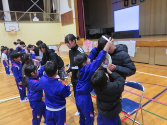 そして、6年生へのプレゼント!1年生は、メダルをつくってプレゼントしました。練習した通り、みんな6年生に感謝の気持ちを伝えることができました。最後は、6年生をエスコートして退場です。