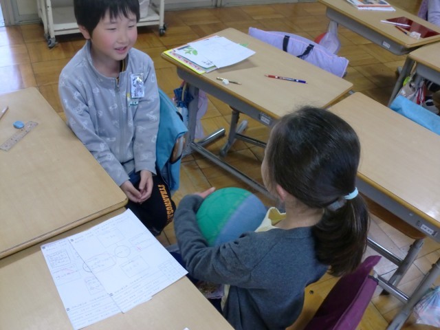 2年生の国語では、自分のすきなことを友達に発表する授業を行いました。その際、聞く人もただ聞くのではなく、「なんで?」「どこで?」「いつ?」など会話を続けることを意識しました。まさに「言葉のキャッチボール」です。