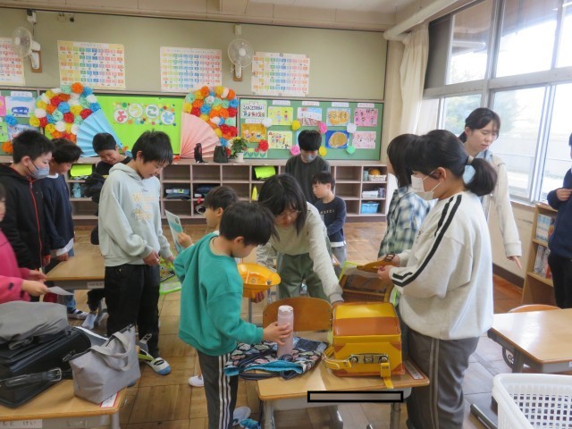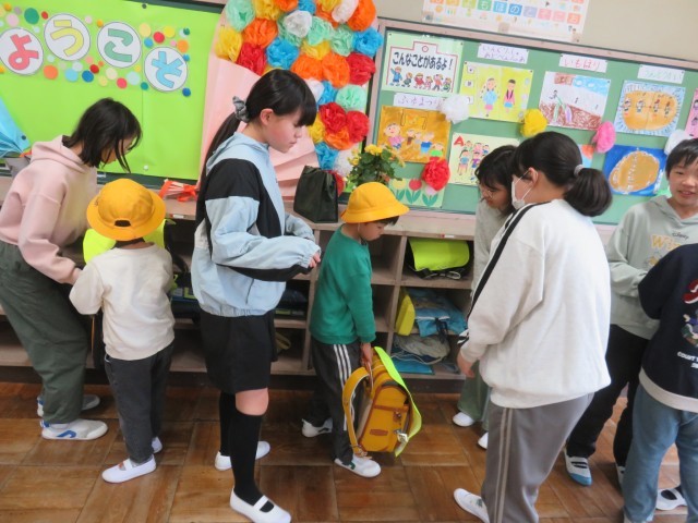 6年生のみんなが早速サポートに入ります。名札付け、ランドセルのしまい方、靴の入れ方・・・