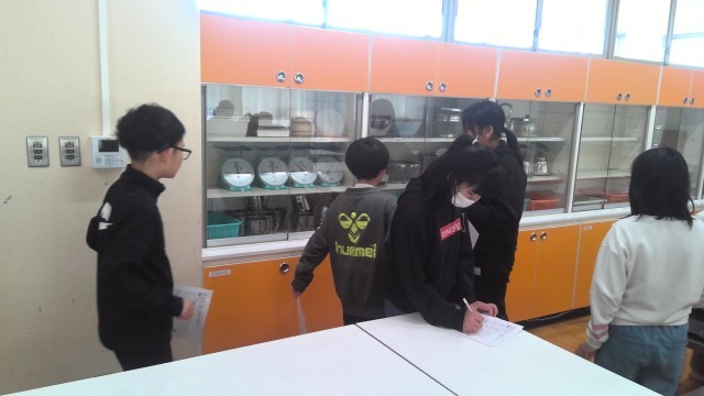 家庭科の授業で、家庭科室にある用具について学習しました。今まで入ることがあっても、じっくりと見たことがなかった家庭科室内ですが、洗濯機があることやガス台や水道の場所に驚いていました。