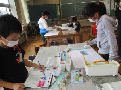 3・4年生 図工 公開日 2022/06/01 更新日 2022/06/01 3年生 3・4年生の複式授業の様子です。色をぼかしたり、 混ぜたりして形にする学習です。 まだ、作品としては未完成で、どんな作品にるのか楽しみです。