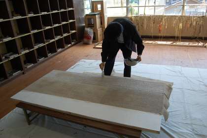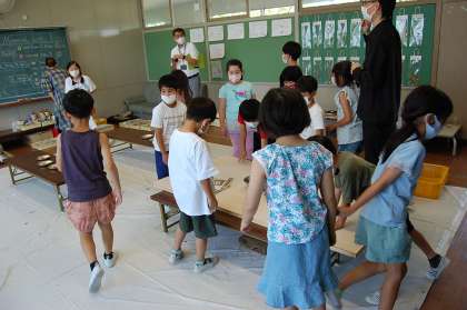 シャオタイ先生と「植物泥絵」を制作する5回のプログラムは終了しましたが、シャオタイ先生が定期的に「となりのスタジオ」を訪れています。のぞいてみると、業間休みと昼休み「となりのスタジオ」に来室した子供たちと大きな作品の制作に取り組んでいました。