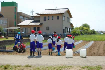 ・1〜4年生が植えた苗、一つ一つに丁寧に水をやる姿