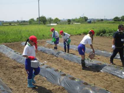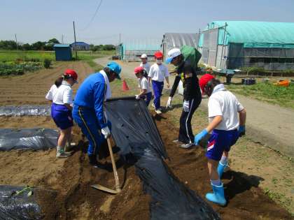 ・余った苗を植えるための畝づくりを手伝い、マルチを張る姿