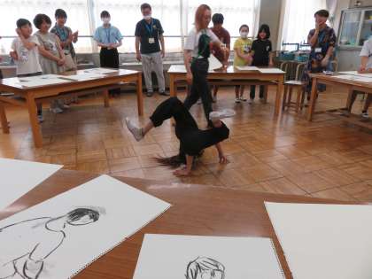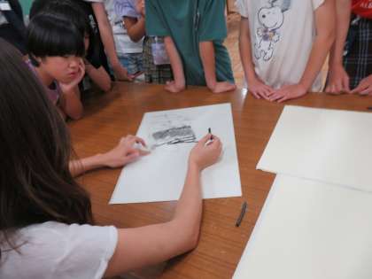 初めに、二人組になってモデルを絵にかきます。マテリアル(材料)は、桑の木で作った木炭です。ヘジョンさんが、炭の特徴を教えてくれました。