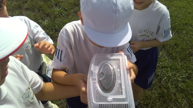 元気よく飛ぶバッタを追いかけたり、葉っぱに乗っているテントウムシに近づいたり、、、みんな楽しそうに生き物と触れ合っていました。