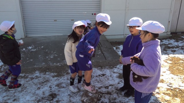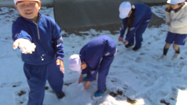 学校に来てすぐに校庭に出て、「さむい~」と言いながらも、みんな楽しそうでした。大きな雪だるまを作ったり、雪を触って感触を楽しんだり、、、。大きな声を出しながら、雪合戦をしたり。
