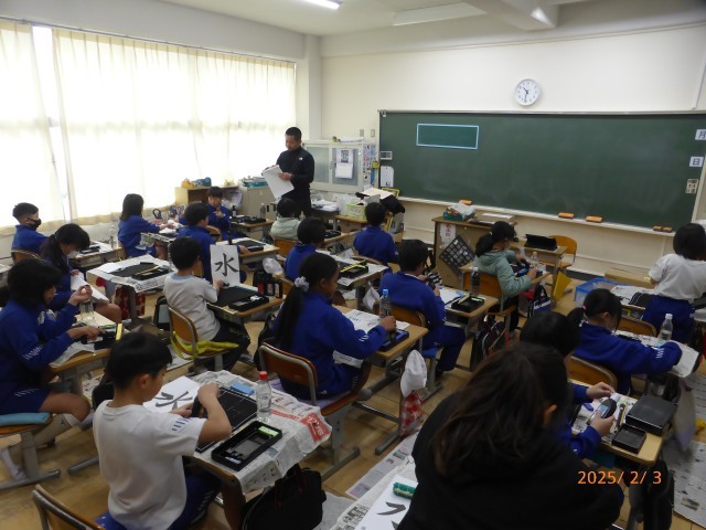 今日は「水」の清書をしました。右側、左側の「はらい」に気を付けて書きました。