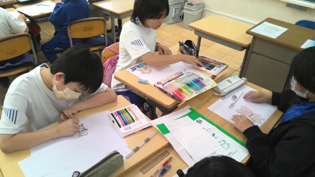 今、6年生では、図工の時間に紙芝居を作っています。テーマは「1年生が喜ぶ紙芝居」です。出来上がったら、1年生に読み聞かせに行きます。どの班も協力して作成しています。