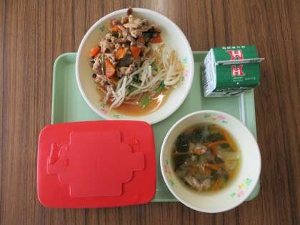 今日の給食は、麦ご飯、牛乳、プルコギ、ナムル、ねぎ塩スープでした。 特にプルコギがよい味付けでおいしかったです。