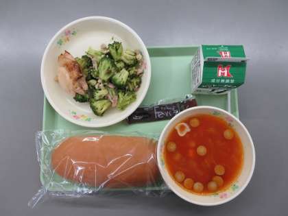 今日の給食 公開日 2024/06/28 更新日 2024/06/28 学校 今日の給食は、コッペパン、チョコクリーム、牛乳、チキンマーマレード焼き、ブロッコリーのガーリックソテー、ミネストローネでした。今日もとてもおいしい献立でした。 7月の給食も楽しみです。