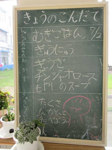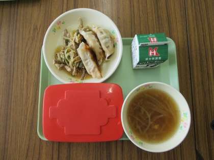 今日の給食は、麦ご飯、牛乳、餃子、チンジャオロース、もやしのスープでした。 中華のおいしい献立でした。