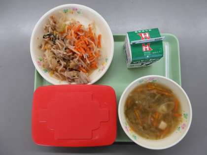 今日の給食は、ご飯、牛乳、キムタクどんの具、おかか和え、あおさのみそ汁でした。