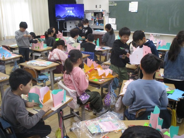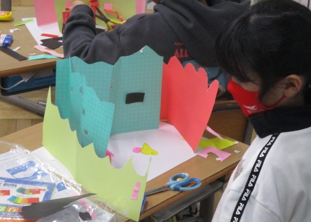 授業の様子(2年図工) 公開日 2025/12/11 更新日 2025/12/11 2年生 「窓のある建物」というテーマで作品を作っています。カッターナイフで工作用紙に窓の部分を切り抜いた材料を使って創作しています。