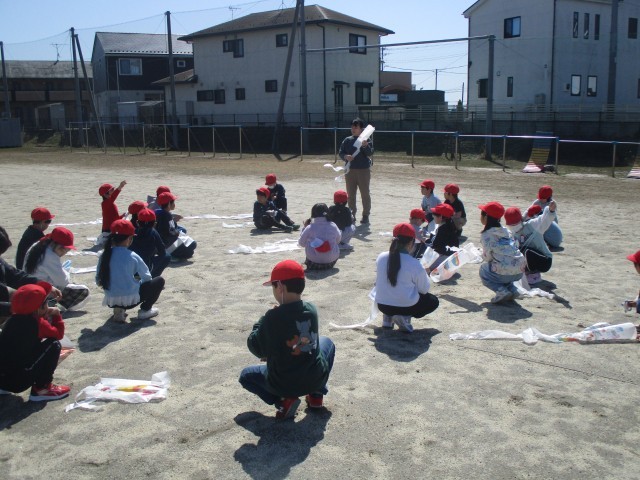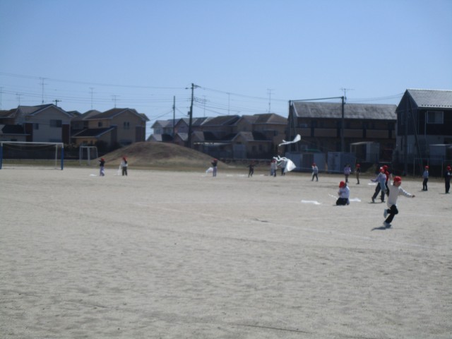 自分で作った凧を校庭で上げました。北風が吹く校庭で、凧あげができました。