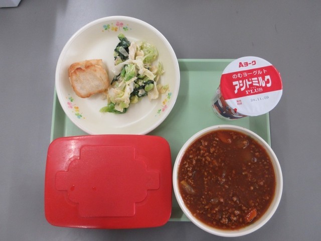 今日の給食は、ごはん、乳飲料、ボロネーゼハヤシ、豆腐ナゲット、グリーンサラダでした。