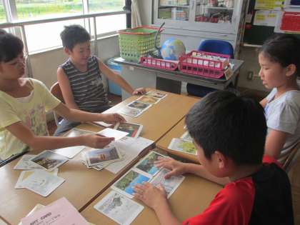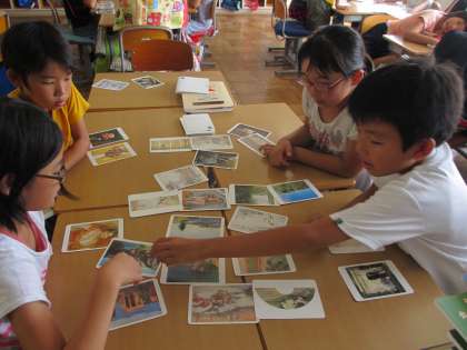 5年2組では,茨城県近代美術館からお借りした「アート・カード」の活動を行ってみました。「アート・カード」とは,近代美術館に所蔵されている絵画を写真と解説付きのカードにしたものです。このカードを使い,楽しく遊びながら美術作品に親しんだり,コミュニケーション能力を高めたり,作品の細部を詳しく見る習慣を身につけたりできます。今日は,「似ているところをつなげるゲーム」(絵同士のつながりを見つけ,言葉で説明する)と,「マイ展覧会」(自分でテーマを決めた絵を集め,友達にテーマをあててもらう)に挑戦しました。子供たちは,「この絵みたことある!」「(近代美術館に)行ったことある!」など,盛り上がりながら楽しく活動することができました。