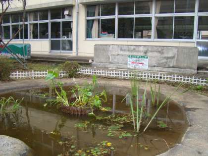 9月8日(月) 雨上がりのミニビオトープを見に行ってみました。完成して10日あまりが経過し,水草も落ち着き,いい感じのビオトープになってきています。近くまでいってじっくり見てみると,何種類かの水草にトンボのヤゴの抜け殻がついていました。さっと20ぐらいはあったでしょうか。早くもこのビオトープから地元産のトンボが羽化したようです。職員室に持ち帰って調べてみると,ノシメトンボという種類であることが分かりました。自然を感じたひとときでした・・・。