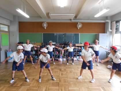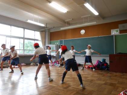 ミニ応援団結成! 公開日 2016/05/27 更新日 2016/05/27 4年生 5・6年生の応援団が競技で応援できない時に活躍します。5・6年生が綱引きをやるときには前に出て,応援の指揮をとります。がんばって声出しの練習をしました。