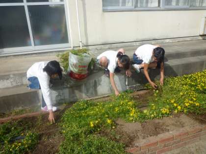 写真は,ラインカーの修理・清掃をしている体育委員会の児童と花壇の草取りをしている市域栽培委員会の児童です。