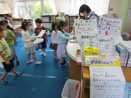 図書委員会が作ったしおりをもらおう 公開日 2016/06/20 更新日 2016/06/20 1年生 6月は図書室でしおりキャンペーン中! 「読書のたびカード」に、5冊本を読み、読んだ本の題名を書くと図書委員が一生懸命作ったしおりがもらえます。 しおりをもらってうれしそうでした。 読書に意欲的な様子が見られました。 たくさんの本に親しんで欲しいです。