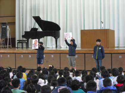 最期に冬休みの過ごし方について,生徒指導主事の先生と六年生の有志「あじのひらき隊」よる,自転車の安全な乗り方「ブタハシャベル」不審者対策「いかのおすし」生活の心得「かきごおり」の合い言葉をみんなで確認しました。