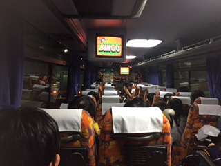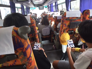 高速道路はやや混んでいますが、バスの中でレクリエーションをしながら楽しく移動中です。