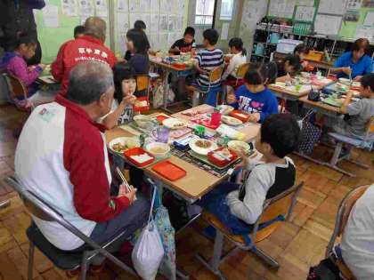 わいわいスポーツクラブの方々が,17名いらしてくださり,グランドゴルフを教えてくれました。8グループに分かれ,1グループに2人付いてくださり,分かりやすく教えてくれました。子ども達もとても楽しむことができ,その後の給食も,楽しく過ごしました。