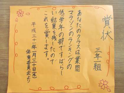 持久走の表彰 公開日 2019/01/30 更新日 2019/01/30 3年生 今日の児童集会では,体育委員会から持久走をがんばったクラスへの表彰がありました。3年1組は,低学年の部で最もたくさん走ったクラスということで賞状をもらうことができました。みんなががんばってもらえた賞状です。教室に掲示して,また他のことにもクラス全員でがんばっていきたいと思います。