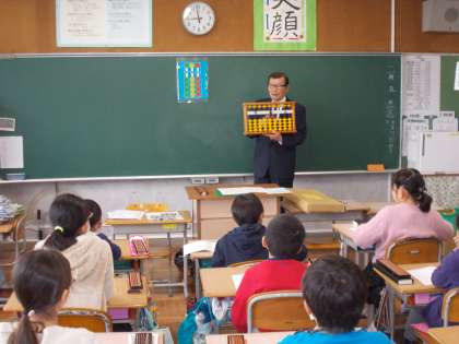 今日は3年生が,そろばん教室の先生をお招きして,そろばん学習を行いました。そろばんの歴史や作り,「何えんなり」や「ごわさんに願いましては」などの独特の言葉の由来などの話を聞くことができました。簡単な足し算と引き算も教わりました。計算機やパソコンがある今の時代には,必要のないものなのかもしれませんが,パズルのように楽しく計算をすすめていくことのできるそろばんのよさを,再認識することができました。