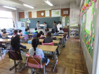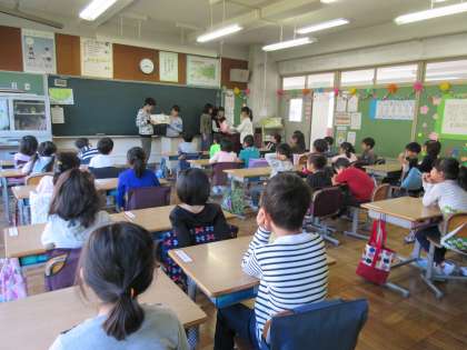 6年生が朝,ランドセルの片付けの手伝いをした後,紙芝居や本の読み聞かせをしてくれています。
