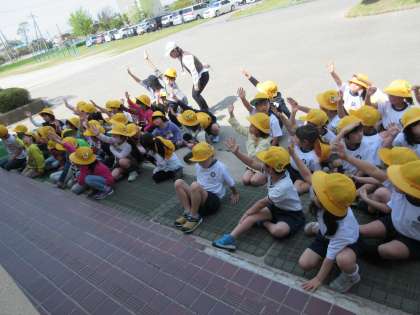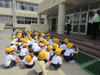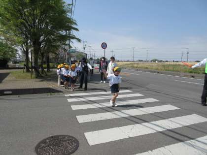 交通安全教室で横断歩道の渡り方を学びました。交差点では車が来ないか右,左,右としっかり自分の目で見て,確認してから渡る練習をしました。