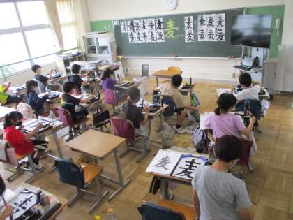 4年生が習字の時間に「麦」の字の学習をしていました。 みんな、左右のはらいに気を付けながら丁寧に書いていました。