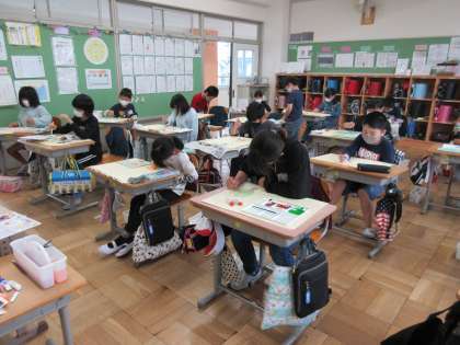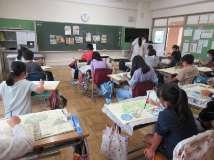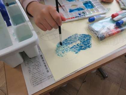 4年生 芸大交流 その2 公開日 2021/10/14 更新日 2021/10/14 4年生 先週に引き続き、芸大の先生に点描画を教えてもらいました。 色づかいや水の量を工夫しながら、思い思いに描いていきます。 仕上がりが楽しみです♪