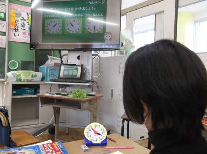 算数の授業では、「なんじなんぷん」の学習をデジタル教科書と模型の時計を使って行いました。短いはりと長いはりを見て、時計が読めるようにがんばりましょう。