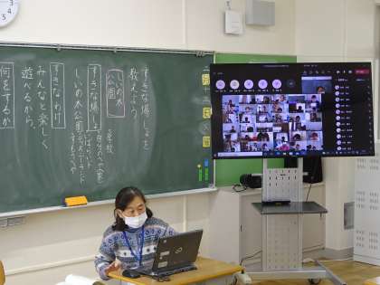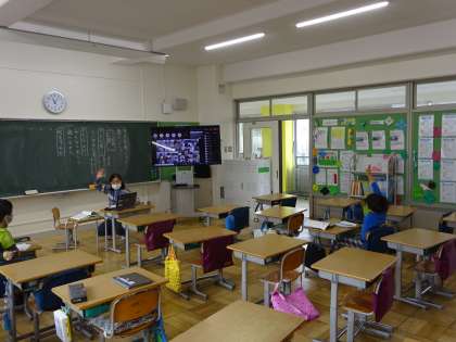 2年生の3時間目は、オンラインによる国語の授業でした。登校している児童と自宅学習の児童が双方向で授業をしました。自分の「すきな場しょをおしえよう」という単元で、自分自身のお気に入りの場所をあげ、理由などを表現する学習をしました。みんな楽しみながら学習できました。