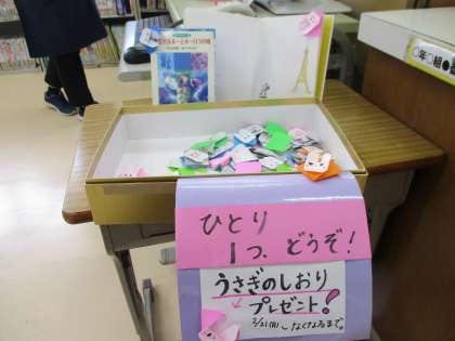 図書室では、バレンタインのプレゼントとして、うさぎのしおりを用意しました。